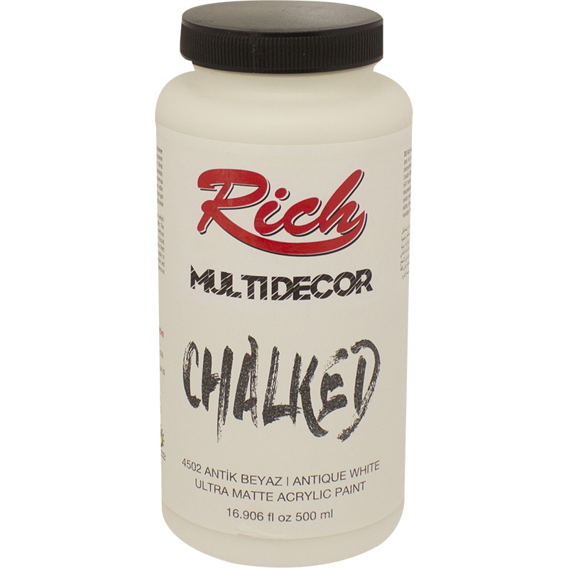 Rich Chalked Boya Antik Beyaz 500ml, dekoratif amaçlı kullanılan su bazlı bir boyadır. Sulandırmaya gerek kalmaksızın direkt uygulanabilen kadifemsi ve mat dokusuyla otantik ve şık bir görünüm elde edebilirsiniz. Yapısındaki esnek pigmentler sayesinde dış etkenlere karşı oldukça dayanıklı üstün kaliteli boyadır. Tuval üzerinde çatlama yapmadığı için ressamlar tarafından da tercih edilmektedir. Kokusuz ve çabuk kuruyan bir yapıya sahiptir. Renk alternatifleri ve tonlamalar elde etmek için beyaz renk tercih edilebilir. Kullanım alanı dekorasyon, mobilya geri dönüşüm, kumaş boyama, resim ve sanata dair birçok alanda kullanılabilir. Chalked boya kuru iken su ile temizlenebilir.