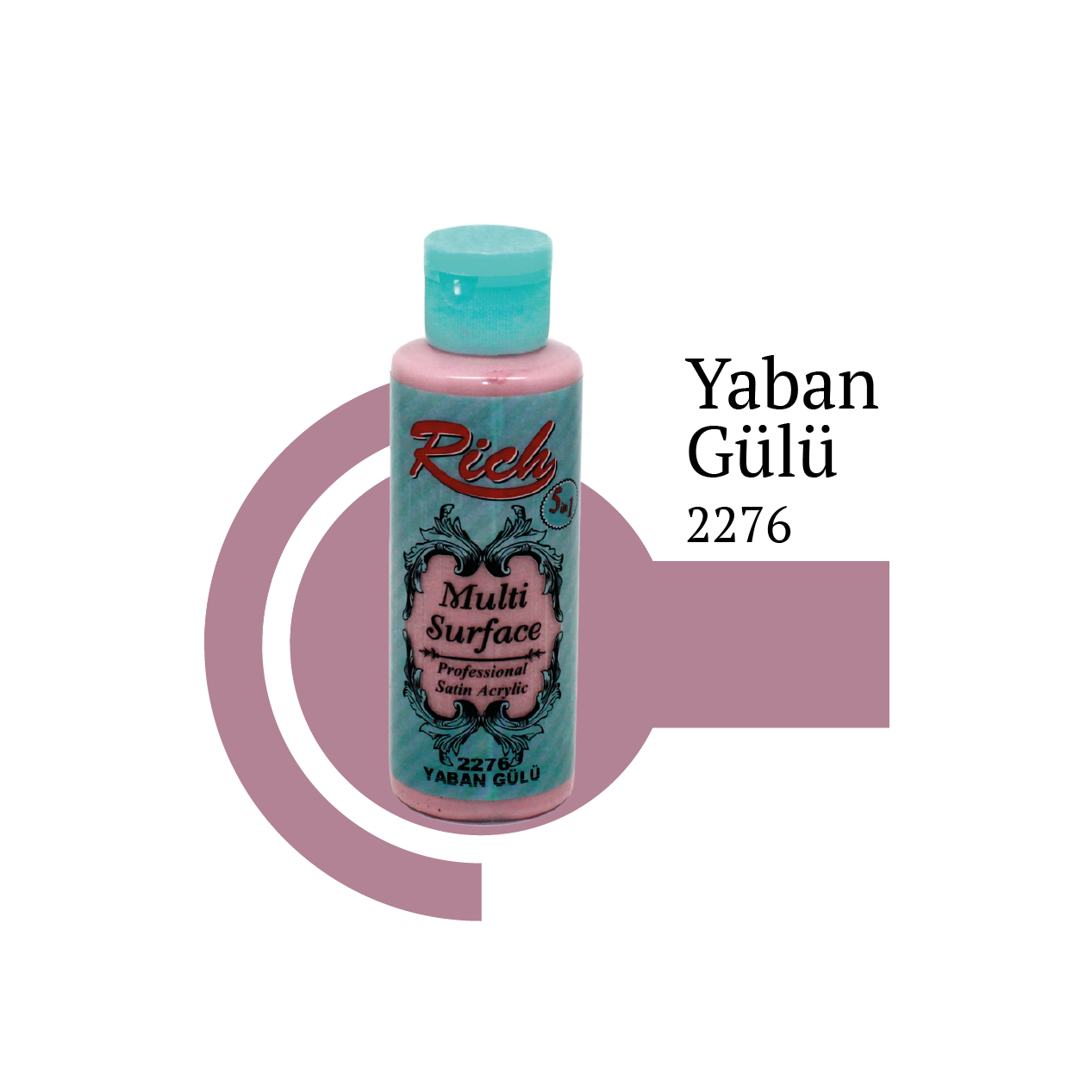 Rich Multisurface Boya Yaban Gülü 120cc, dekoratif amaçlı kullanılan su bazlı bir boyadır. Yağlı boya kıvamında, suluboya parlaklığında su bazlı bir boya türüdür. Yapısındaki esnek pigmentler sayesinde dış etkenlere yağlı boyadan daha dayanıklıdır. Tuval üzerinde çatlama yapmadığı için ressamlar tarafından da tercih edilmektedir. Kokusuz ve çabuk kuruyan bir yapıya sahiptir. Renk alternatifleri ve tonlamalar elde etmek için beyaz renk tercih edilebilir veya suyla da inceltilebilir. Kullanım alanı resim sanatıyla sınırlı olmayıp dekorasyon, mobilya geri dönüşüm, kumaş boyama ve sanata dair birçok alanda kullanılabilir. Multisurface boya kuru iken su ile temizlenebilir.