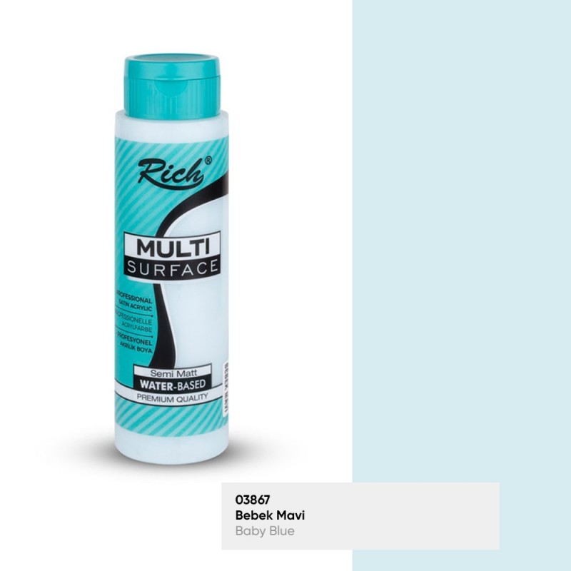 Rich Multisurface Boya Bebek Mavi 500cc, dekoratif amaçlı kullanılan su bazlı bir boyadır. Yağlı boya kıvamında, suluboya parlaklığında su bazlı bir boya türüdür. Yapısındaki esnek pigmentler sayesinde dış etkenlere yağlı boyadan daha dayanıklıdır. Tuval üzerinde çatlama yapmadığı için ressamlar tarafından da tercih edilmektedir. Kokusuz ve çabuk kuruyan bir yapıya sahiptir. Renk alternatifleri ve tonlamalar elde etmek için beyaz renk tercih edilebilir veya suyla da inceltilebilir. Kullanım alanı resim sanatıyla sınırlı olmayıp dekorasyon, mobilya geri dönüşüm, kumaş boyama ve sanata dair birçok alanda kullanılabilir. Multisurface boya kuru iken su ile temizlenebilir.
