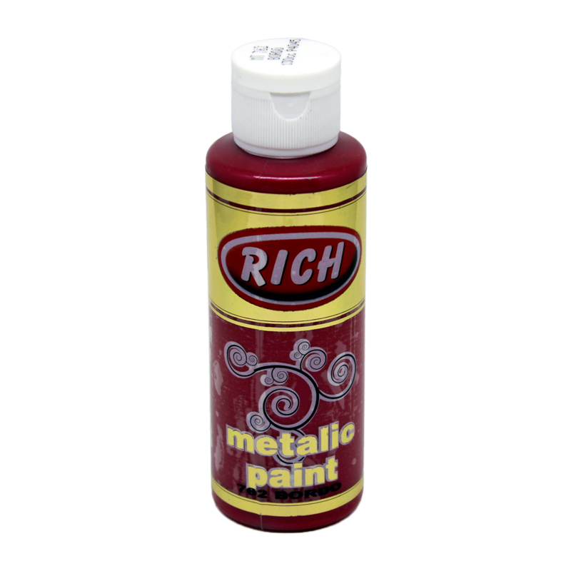 Rich Akrilik Metalik Boya Bordo 120cc, dekoratif amaçlı kullanılan su bazlı bir boyadır. Rich Metalik Akrilik grubu dekorasyon ve sanatsal hobi çalışmalarında kullanılan metalik görünüm kazandıran boyalardır. Sağlığa hiçbir zararı olmayan yüksek kalitesiyle darbelere silinmelere, sürtünmelere karşı oldukça dayanıklıdır. Ahşap, cam, seramik, mdf, tuval ve polyester gibi farklı yüzeylerde de rahatlıkla kullanılabilir. Kokusuz ve çabuk kuruyan bir yapıya sahiptir. Renk alternatifleri ve tonlamalar elde etmek için kendi grubunda renk tercih edilebilir. Rich Metalik Akrilik yapısı gereği su bazlı ve solvent bazlı vernikler ile çalışmaya uygundur. Tavsiyen 2 kat uygulanmalıdır. Akrilik boya kuru iken su ile temizlenebilir.