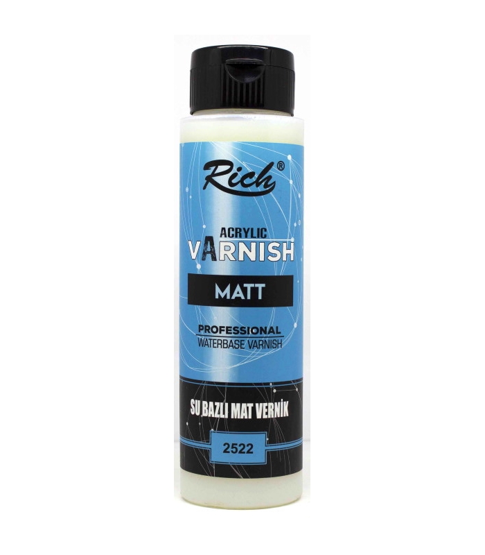 Rich su bazlı vernik dekorasyon ve sanatsal hobi çalışmalarında kullanılan su bazlı kokusuz verniklerdir. Sağlığa hiçbir zararı olmayan yüksek kalitesiyle darbelere silinmelere sürtünmelere karşı oldukça dayanıklıdır. Ahşap, cam, seramik, mdf, tuval ve polyester gibi farklı yüzeylerin haricinde özel yapısı sebebi ile varak üzerinde bile uygulanabilir. Kıvamından dolayı fırça izi ve karartma yapmaz. Su ile inceltmeyiniz.